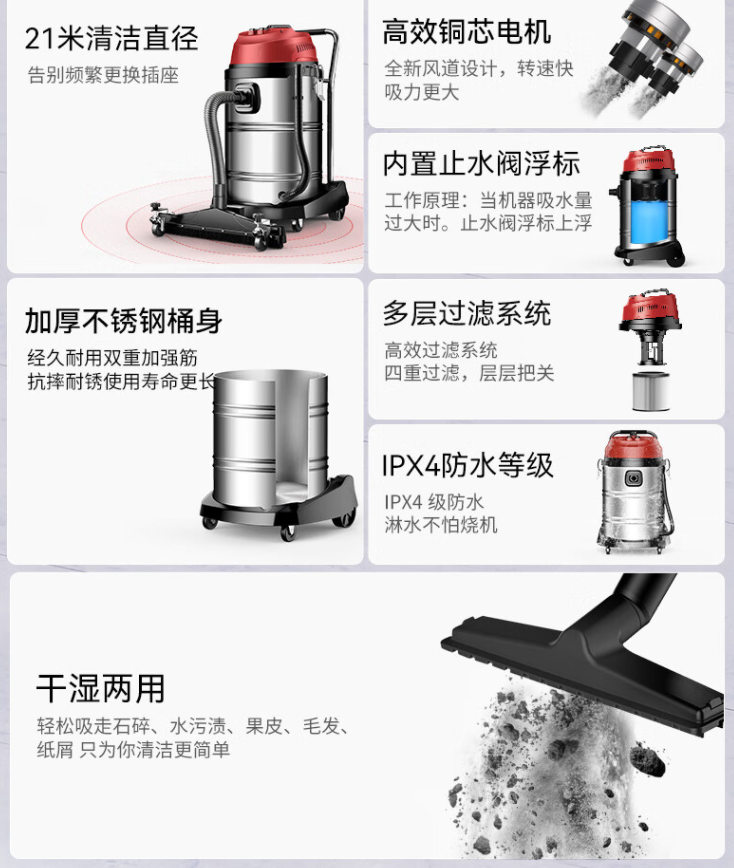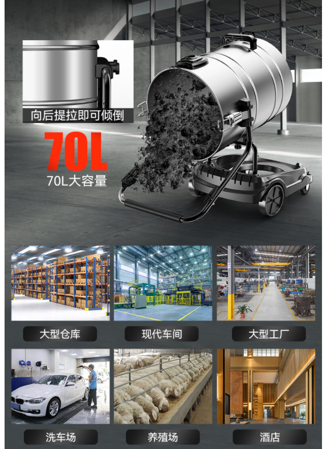 揚(yáng)子(YANGZI)3500W大功率70L強(qiáng)力大容量吸塵器工業(yè)大型桶式吸塵機(jī)商用大吸力酒店工廠車間推吸大地刷粉塵機(jī)